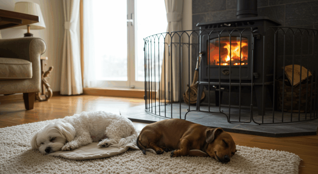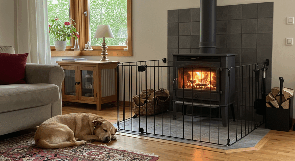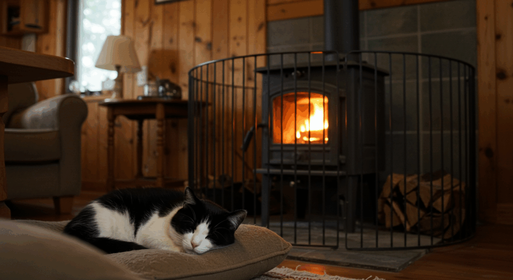 ストーブ周りに安全柵を設けて本体に近づけないようにしても、たとえば薪が爆ぜる音によって、ペットがパニックになることがあります。