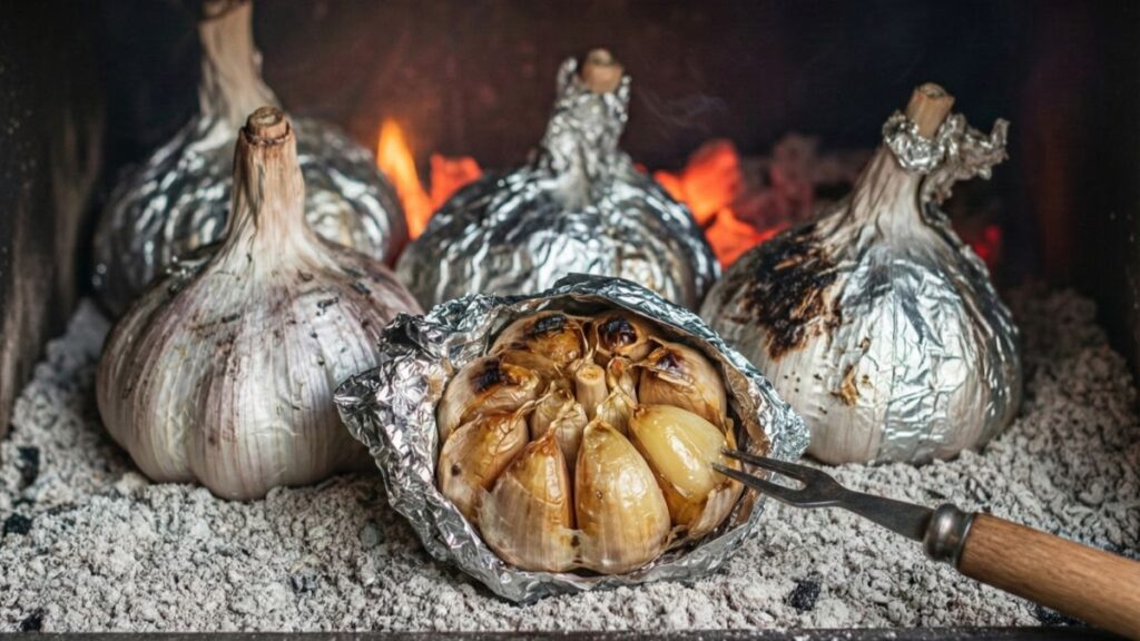 熾火から離れた灰の中は、サツマイモやジャガイモだけでなく、ニンニクの調理にも最適です。長時間じっくり加熱することで、ニンニクの辛味が抜け、ねっとり甘いホクホク食感に変わります。